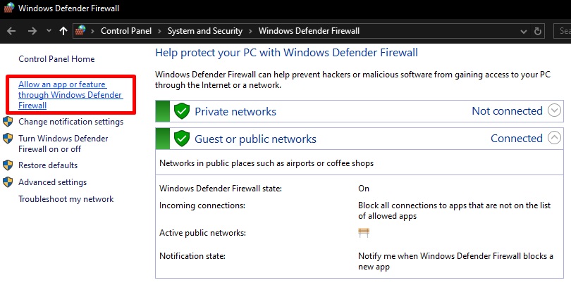- Click on Allow an app or feature through Windows Defender Firewall.