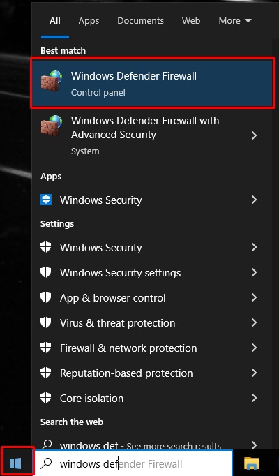 - Open the Start Menu and search for Windows Defender Firewall.