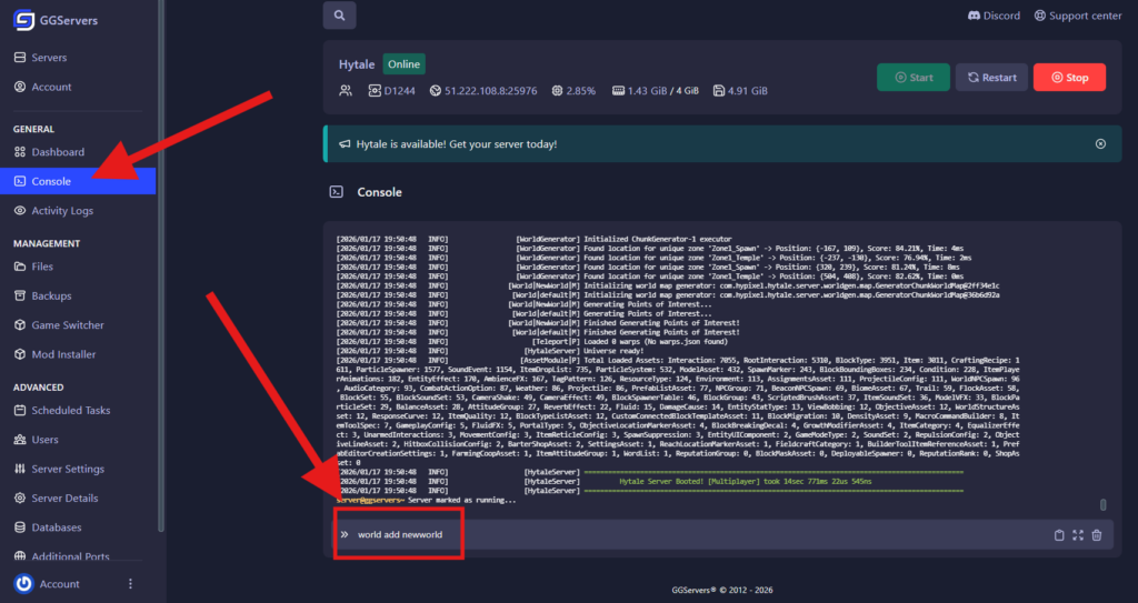 - Select your Hytale server and navigate to the Console tab on the left-hand sidebar.
