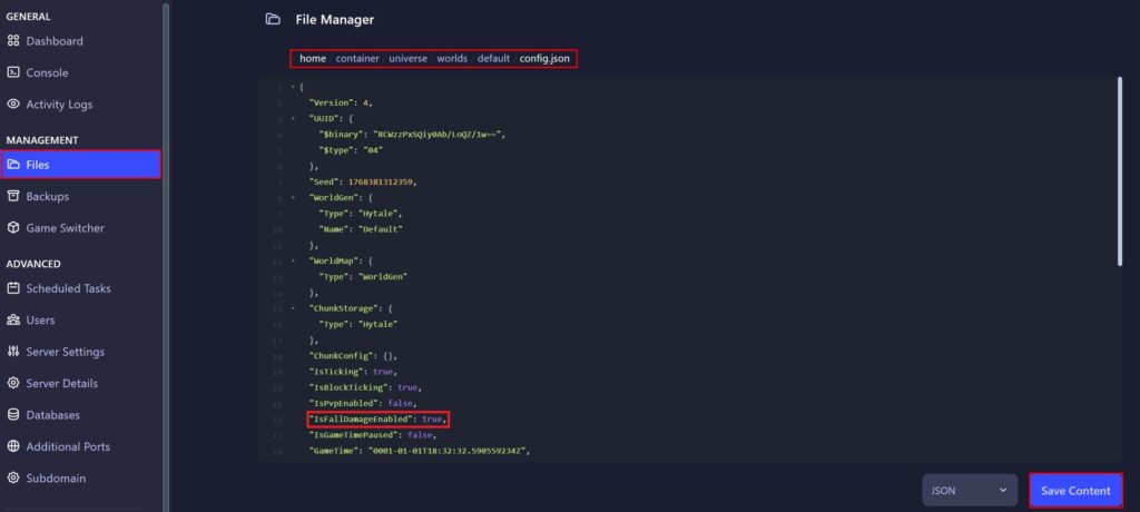 - Access /home/container/universe/worlds/default/ and open config.json.