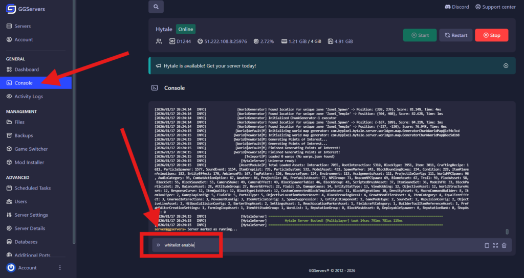 - Navigate to your Console tab in the GGServers panel.