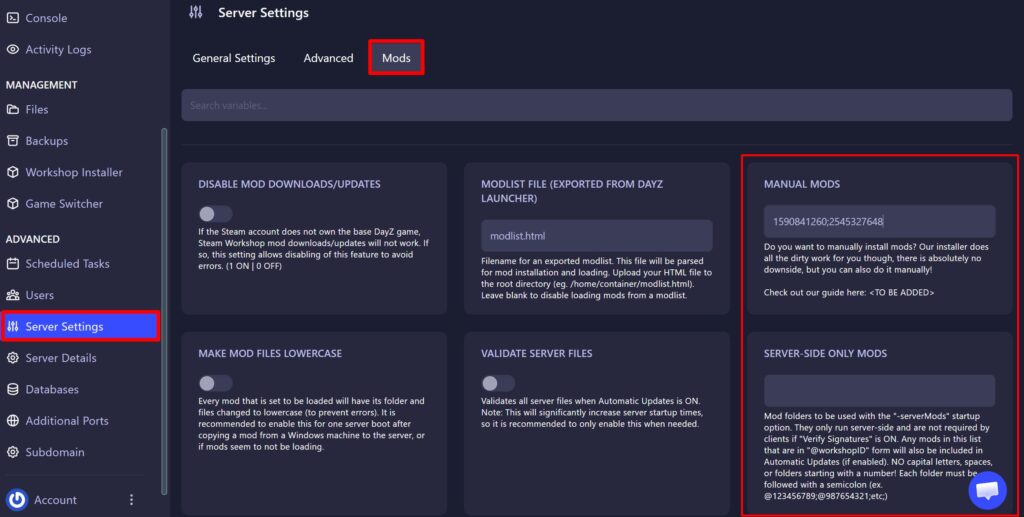 - In Manual Mods or Server-Side Only Mods (depending on your needs), enter mod IDs separated by a semicolon (