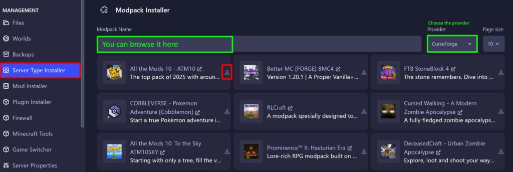 You can browse and select the provider (CurseForge/Modrinth/FTB)