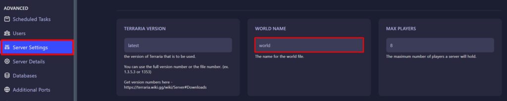 - Go to the Server Settings tab and set the world name to match your uploaded file.
